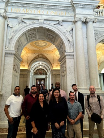 Como parte de los esfuerzos de participación de la comunidad, el fellow de JLUSA, el Dr. Aaron Kinzel, viajó a Washington, D.C., para participar en una formación sobre defensa de los derechos con EdTrust, que se centra en empoderar a las comunidades afectadas por la justicia. Mientras estuvo en DC, visitó varios lugares y se reunió con defensores locales que ayudan a dar forma a la reforma de la justicia penal y a desarrollar estrategias para movilizar a las personas en favor de un cambio efectivo. El Dr. Kinzel también recibió una visita guiada entre bastidores de la Library of Congress, donde pudo ver objetos originales, como los borradores de la Enmienda 13 de la Constitución de los Estados Unidos (United States Constitution). Obtuvo una tarjeta de identificación de lector, otorgándole acceso a la colección de la biblioteca más grande del mundo, que apoyará sus contribuciones al proyecto JUSTResearch.